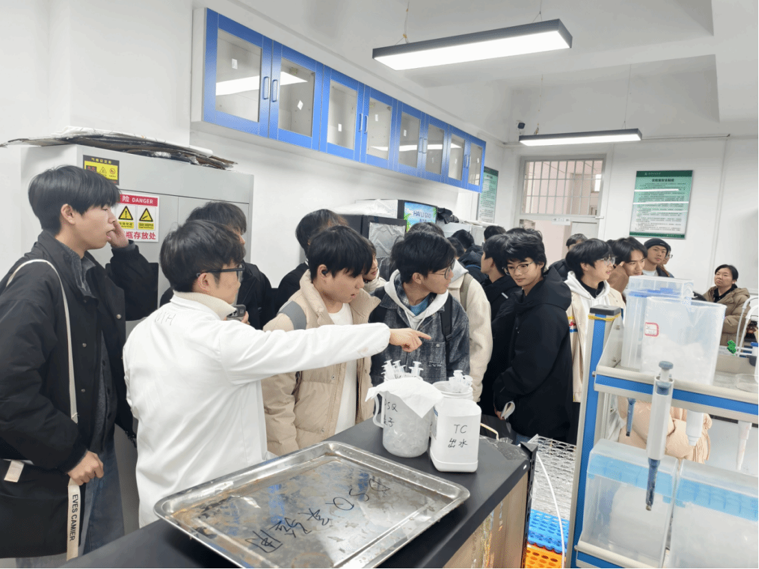 各位老师为同学们系统讲解了实验室的功能布局、主要设备及其在专业教学与科研中的重要作用。建环实验室展示了建筑节能、室内环境监测等平台,陈敏结合实际讲解了相关技术在绿色建筑与低碳发展中的应用,并指出部分实验室平台由校友捐赠搭建,承载着对母校的深情,彰显了校友反哺的优良传统,令同学们深受鼓舞。在给排水实验室,樊杰、邓佳讲解了水资源处理、管道系统和水质监测等环节,由相关专业研究生进行现场操作演示,通过理论与实践的生动结合,系统阐述了该学科在保障水安全、推动水资源循环利用方面所发挥的重要作用。